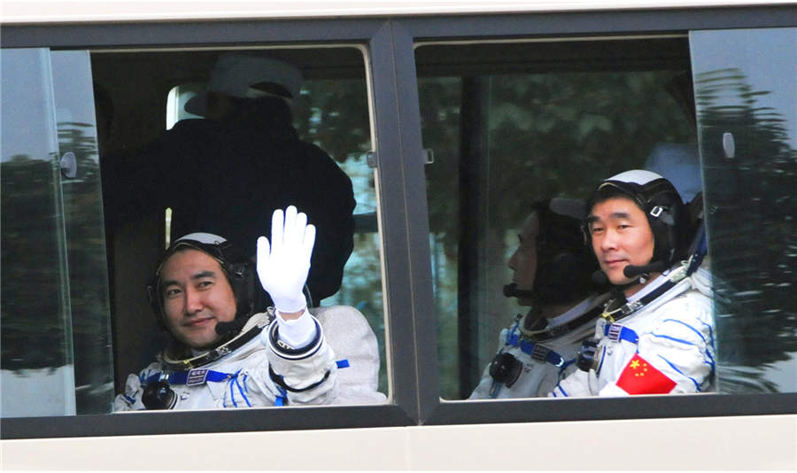 Shenzhou Ⅶ astronauts Zhai Zhigang, Liu Boming and Jing Haipeng start their journey at Dongfeng space city at 5:30 pm on Sept 25, 2008. [Photo by Wu Yunsheng/cpanet.org.cn]