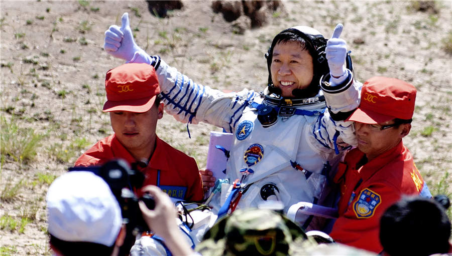 Shenzhou Ⅸ astronaut Liu Wang gets out of the capsule after landing at 11:10 am on June 29, 2012. [Photo by Wu Yunsheng/cpanet.org.cn]