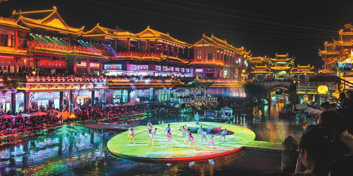 Visitors enjoy an immersive performance staged on the water in Meishan, Sichuan province, on Wednesday. During the National Day holiday, large numbers of tourists have flocked to scenic spots across the country. YAO YONGLIANG/XINHUA