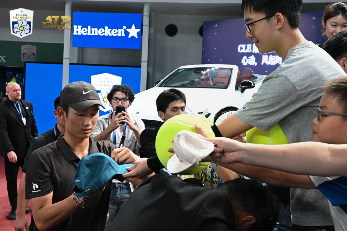 Shang Juncheng signs autographs for fans in Shanghai on Saturday after achieving his deepest run so far at an ATP 1000 tournament, fighting his way into the third round of the Rolex Shanghai Masters. PROVIDED TO CHINA DAILY
