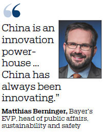 "In the past two years, China has made tremendous progress. It's now among the leading nations. It is not dominant, but really strong. We see it in the pharmaceutical space where China-led innovation is becoming very attractive for global pharmaceutical companies such as Bayer. The startup world is really amazing in that space. We created a Co.Lab, where startups can cooperate with our scientists. I believe that for Bayer, there will be huge opportunities in striking deals with Chinese innovators in the space of pharmaceuticals," Berninger said.