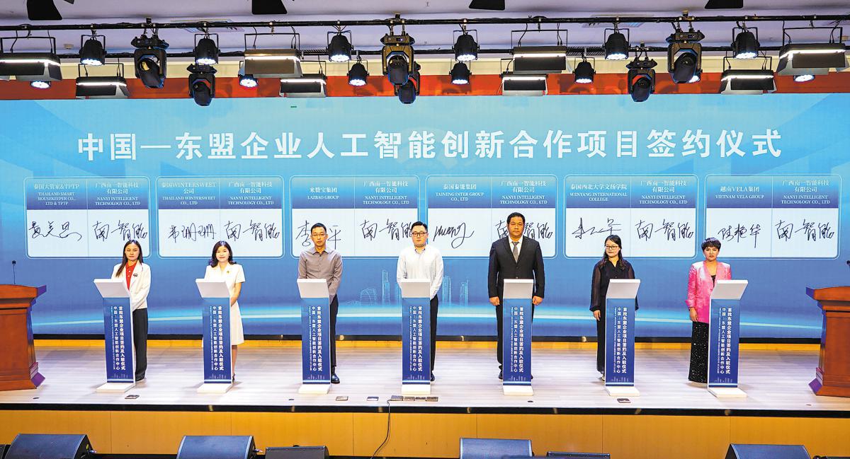 Representatives from China and ASEAN companies sign an agreement for an AI innovation cooperation project in Nanning, the Guangxi Zhuang autonomous region, on June 29. YE ZIRONG/FOR CHINA DAILY