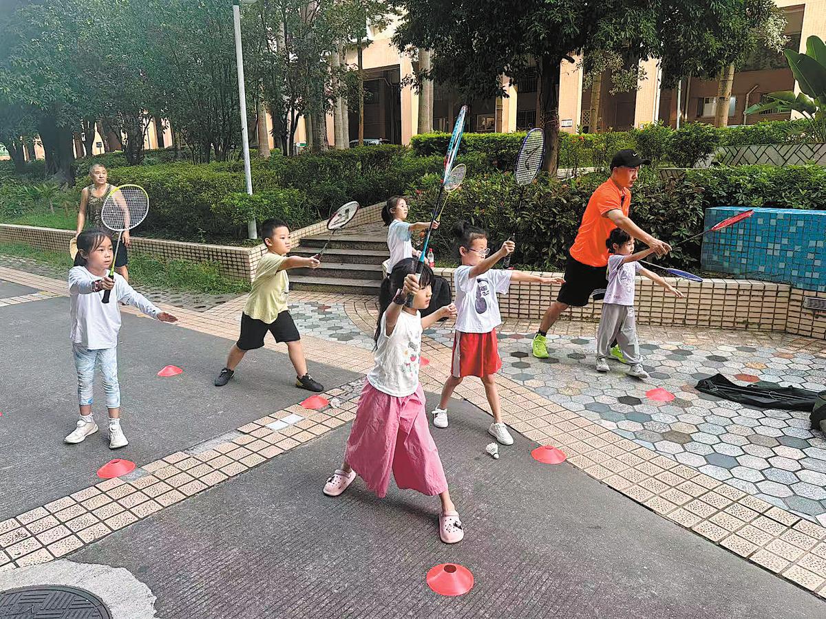 A coach from One Jump Sports trains children in stances for badminton at a residential community in Shenzhen, Guangdong province. [Photo provided to CHINA DAILY]