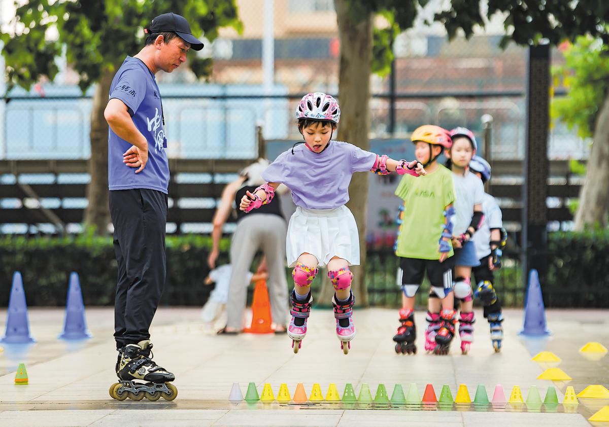 Supervised by a coach, children jump over cones during their roller-skating training at a public square in Jining, Shandong province, in July. [Photo provided to CHINA DAILY]