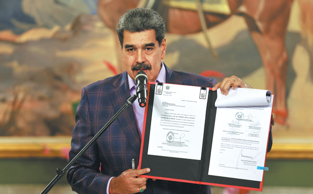 Venezuela's President Nicolas Maduro displays a document outlining a new national defense framework in Caracas on Tuesday. MIRAFLORES PALACE/REUTERS