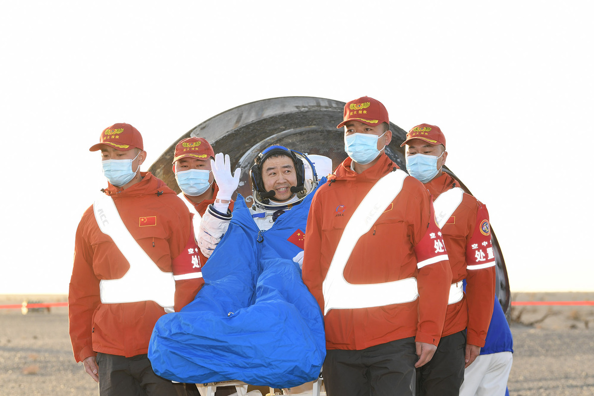 Astronaut Chen Dong, commander of the three-member Shenzhou-XX crew, is out of the Shenzhou-XXI spaceship's return capsule after it touched down on Earth at the Dongfeng landing site in North China's Inner Mongolia autonomous region, Nov 14, 2025. [Photo by Wang Jiangbo/for chinadaily.com.cn]