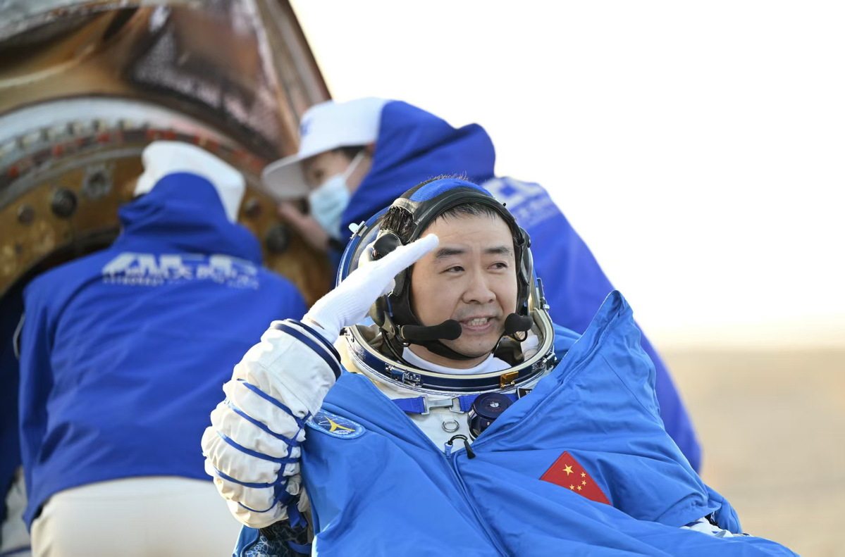 Astronaut Chen Dong, commander of the three-member Shenzhou-XX crew, is out of the Shenzhou-XXI spaceship's return capsule after it touched down on Earth at the Dongfeng landing site in North China's Inner Mongolia autonomous region, Nov 14, 2025. [Photo by Sun Haiying/for chinadaily.com.cn]