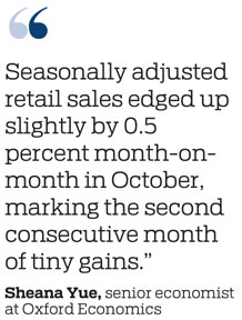 Sheana Yue, senior economist at Oxford Economics, said October's retail data offered cautious optimism. "Seasonally adjusted retail sales edged up slightly by 0.5 percent month-on-month in October, marking the second consecutive month of tiny gains."