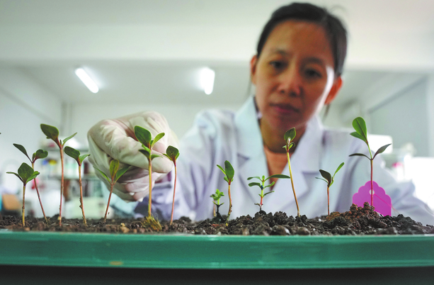 A researcher checks the status of red-flowered black mangrove tree saplings at a lab at the Sanya Academy of Forestry on Nov 5. WANG CHENGLONG/FOR CHINA DAILY