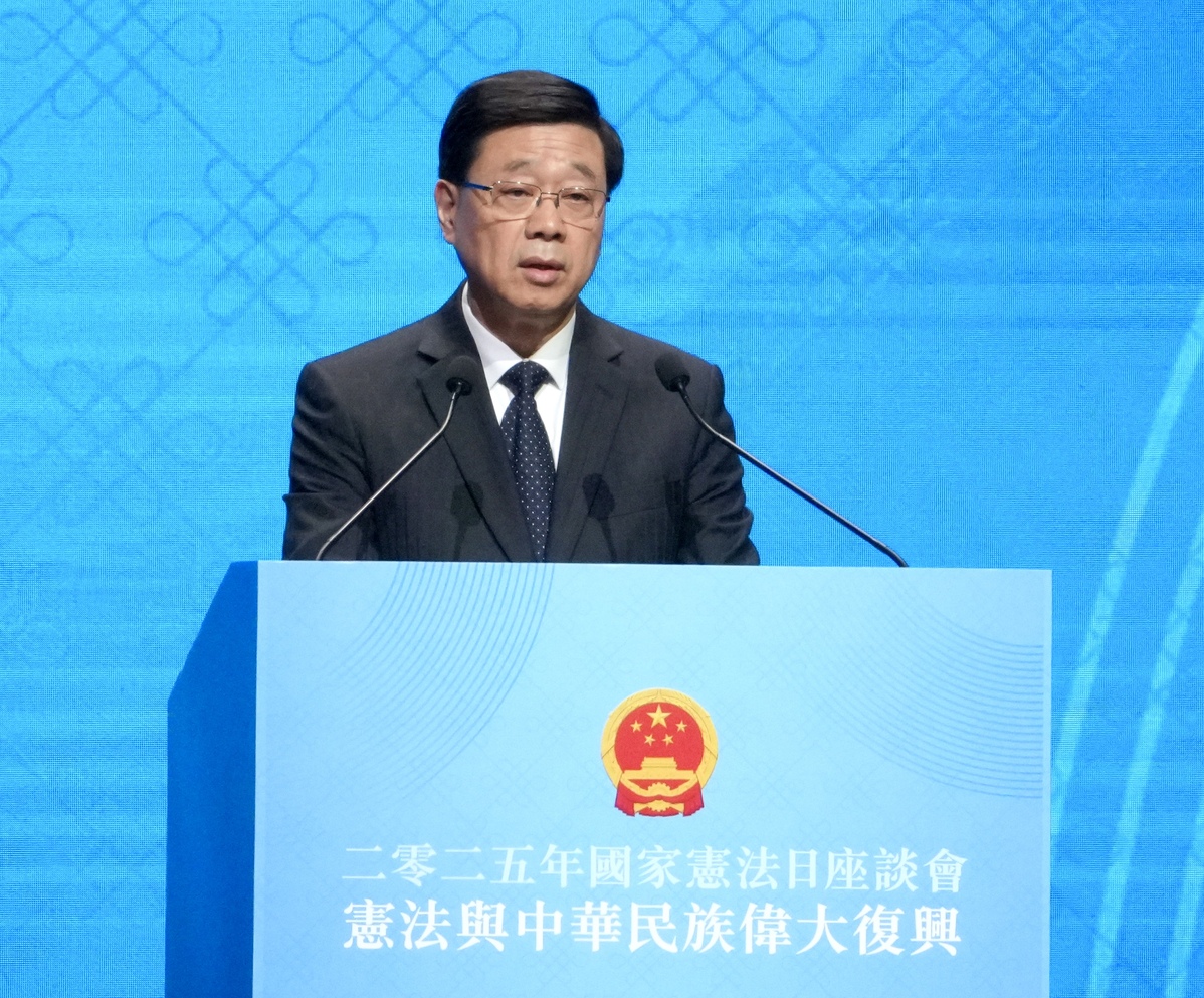 Hong Kong Chief Executive John Lee Ka-chiu delivers a speech at the 2025 Constitution Day seminar, themed "The Constitution and the Great Rejuvenation of the Chinese Nation", at the Hong Kong Convention and Exhibition Centre in Wan Chai on Dec 4, 2025. [ADAM LAM / CHINA DAILY]
