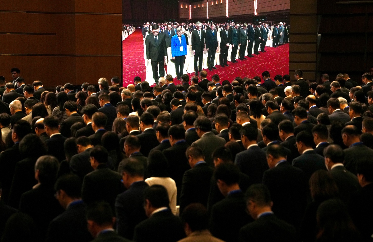 Attendees observe a minute's silence in memory of the victims of the fire at Wang Fuk Court during the 2025 Constitution Day seminar at the Hong Kong Convention and Exhibition Centre in Wan Chai on Dec 4, 2025. [ADAM LAM / CHINA DAILY]