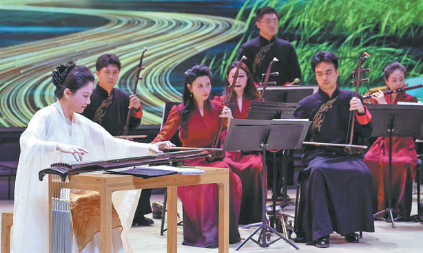 Guqin performer Lu Ning (left) of the China National Traditional Orchestra performs the Grand Canal Rhapsody with fellow musicians. CHINA DAILY