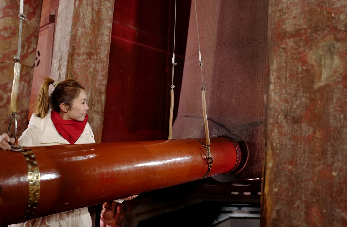 A visitor rings a bell for blessings at the Ancient Bell Museum in Dazhong Temple in Haidian district, Beijing on Dec 31. [Photo by Hua Yuhan/chinadaily.com.cn]