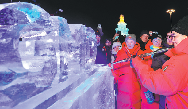 After the opening ceremony on Tuesday, representatives participated in a uniquely immersive experience in the specially designated ice sculpture experience zone at the Harbin Ice and Snow World. Using professional ice-carving shovels, they carved the event's logo onto an ice block, experiencing Harbin's ice-and-snow culture firsthand.