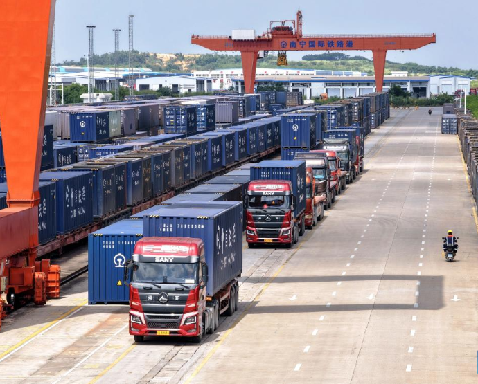 An aerial drone photo taken on Sept 23, 2025 shows the Nanning International Railway Port in Nanning, South China's Guangxi Zhuang autonomous region. [Photo/Xinhua]