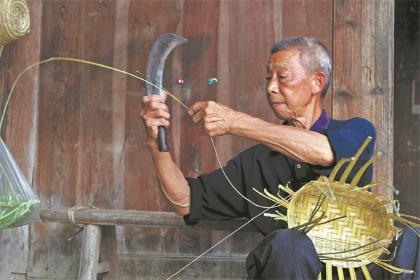 An elderly artisan preserves traditional bamboo-weaving techniques.[Photo provided to China Daily]