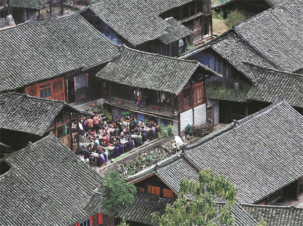 Villagers gather in Loushang, an ancient village in Guizhou province, for a family feast.[Photo provided to China Daily]