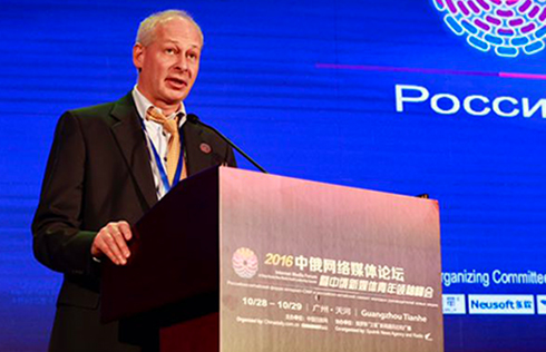 Alexey Volin, deputy minister of Telecom and Mass Communications of the Russian Federation, delivers a speech on Oct 29, 2016 during the China-Russia Internet Media Forum & China-Russia New Media Youth Leadership Summit being held in Tianhe, Guangzhou city. [Photo by Zhu Xingxin/chinadaily.com.cn]