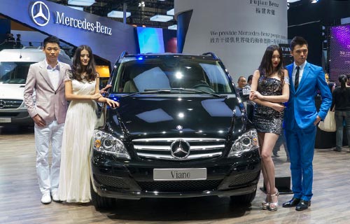 Models pose next to Mercedes Viano MPV during the 2013 Auto Guangzhou on Nov 21, 2013, the media day of the auto show.