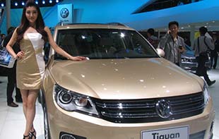 A model poses beside a Volkswagen China car at the Auto China 2012 in Beijing on April 24, 2012.
