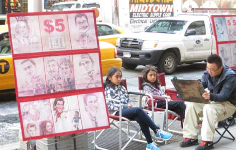 Every morning around 8 am, Zhao Xiaopeng sets up his easels and unfolds a portable stool and chairs on a sidewalk in Times Square.