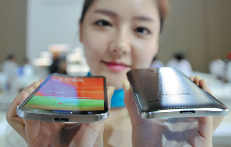 Models display the Samsung Galaxy Gear smartwatch and Galaxy Note 3 smartphone in Chongqing, Sept 25, 2013.