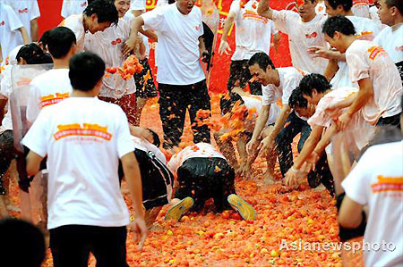 Some people fall to the ground covered in tomatoes at Huanan Mall in Dongguan City, Guangdong province, October 19, 2008. Some 15 tons of ripe tomatoes were used. The tomato fight attracted more than 10,000 people.[Asianewsphoto]