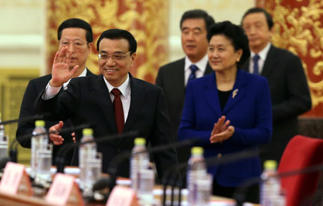 Premier Li Keqiang outlined the top three tasks of the new government over the next five years, and vowed to push forward reforms and the rule of law on Sunday.
