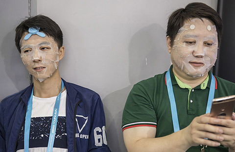 A visitor uses AR glasses to look at replicas of Michelangelo's frescos at a preview of the Genesis exhibition in Shanghai, June 6, 2017. [Photo/VCG] |