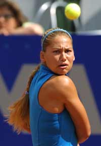 Russia's Anna Kournikova watches the ball before returning a forehand shot to Marta Marrero of Spain during their match at the Rome's Italian Open May 13, 2002. Kournikova won 6-3 6-3.