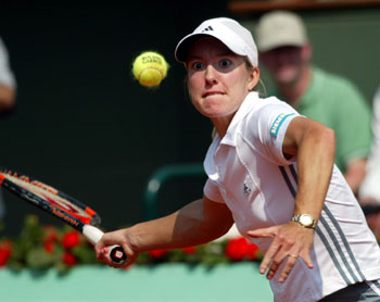 Austine Henin-Hardenne of Belgium eyes the ball before returning to Jelena Kostanic of Croatia at the French tennis Open championships at Roland Garros stadium in Paris, May 28, 2003. Henin-Hardenne won 6-2 6-2. [Reuters]