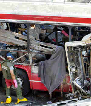 An Israeli policeman searches a bus destroyed by a suspected Palestinian suicide bomber in Jerusalem June 11. A Palestinian suicide bomber killed at least 16 people and injured nearly 100 on a Jerusalem bus on Wednesday to avenge an Israeli bid to assassinate a Hamas leader; Israel struck back within minutes, killing seven. [Reuters]