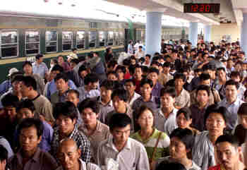 Passengers pour off a train at Beijing Railway Station June 17, 2003. Effective containment of severe acute respiratory syndrome has encouraged people, mostly migrant workers, to travel back to the capital again. [newsphoto.com.cn]