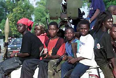 Youth supporters of the Liberian government hold automatic weapons and a rocket launcher as they travel through Monrovia June 30, 2003. UN Secretary-General Kofi Annan kept up pressure on the US to lead intervention in Liberia on Monday as troops strengthened defenses around battle-worn Monrovia in fear of another bloody rebel attack. West African countries pledged troops for a peacekeeping force on Sunday, but they want help from the US to prevent a bloodbath in the capital and end nearly 14 years of violence that have infected the impoverished region. [Reuters]
