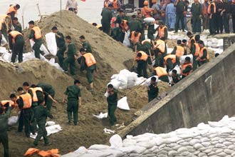 temporary sandbag wall, built a day earlier as a secondary safeguard