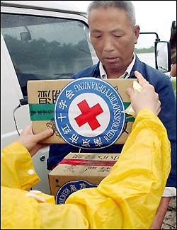 Chinese farmer receives food aid from the Red Cross after
