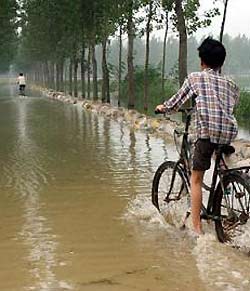 A boy rides a bicycle on a flooded road in a