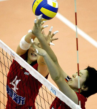 Liu Yanan (left) and Chu Jinling of China block the ball during a match against Canada in the 2003 World Volleyball Grand Prix held in Italy. China won 3-0. [xinhua]