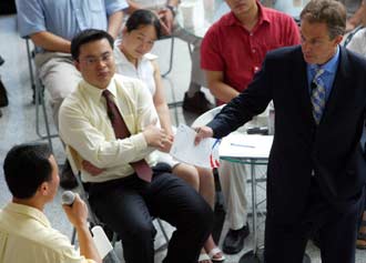 speaks with students from Tsinghua University in Beijing Tuesday, July 22,