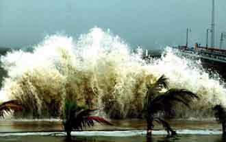 The picture shows huge waves caused by Typhoon Imbudo in Hainan Province July 24, 2003. [newsphoto.com.cn]