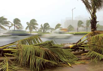 Pedestrians advance with difficulty on a street in Haikou, capital of South China's island province of Hainan, which was hit by Typhoon Imbudo July 24, 2003. At least 4 people have been killed, 16 others injured when it struck South China's Guangdong Province Thursday. [newsphoto.com.cn]