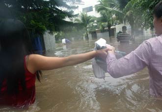 Local residents walk in the flooded street in South China's Hainan Province July 24, 2003. [newsphoto.com.cn]