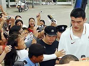 Chinese basketball star Yao Ming, currently playing in the NBA for the Houston Rockets, is cheered by fans as he arrives for a welcome ceremony in Hong Kong Tuesday, Aug. 5, 2003. [AP]
