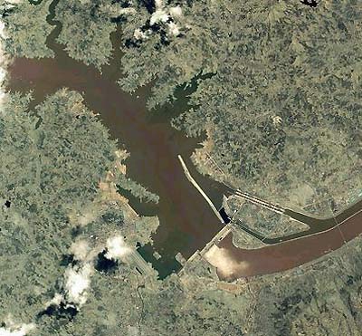 A satellite photo taken by the QuickBird of the US, July 15, 2003, shows a full view of the mammoth-sized Three Gorges dam and part of its reservoir on the middle reaches of the Yangtze River.