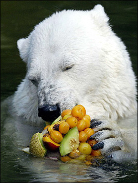 Hanover zoo in Germany nibbles on a block of frozen fruits to coll off.