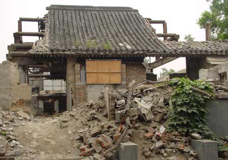 Yu Qian was the minister of defence in the early Ming Dynasty (1368-1644). Under his lead, Ming soldiers and people successfully defended the capital against the attack of Mongolian nomads in 1449. However, Yu was beheaded on the orders of the then Ming emperor, who accused Yu of putting his life in danger. But people built the Yu Qian Temple in memory of Yu's courage. Today, Yu Qian Temple is littered with debris and dissembled old furniture. The roofs of several rooms are holed and thick dust coats a wine-coloured folding screen in a room at the rear of the complex. A woman sitting outside the old courtyard said she was entrusted by the Beijing Bureau of Cultural Heritage to stop the house from being destroyed. "Originally it was said the residence would be removed to build a new mansion, and now the cultural heritage bureau says it will be preserved and I was sent here to guard against thieves," said the woman, who only identified herself as Li. Chen Zhihua, a professor of ancient architecture with Tsinghua University, said the wooden structure of the ancient rooms would be destroyed within one rainy season because of the holes in their roofs. Officials from the municipal cultural heritage bureau said the temple would not be demolished, but the protection plan had not been finalized. The race between bulldozers and conservation is a fierce one, despite the fact that top Beijing municipal officials have repeatedly called for ancient Beijing to be protected. About 50 metres south of Yu Qian Temple lies a silent and delicate courtyard in which plants, rockwork, a bridge and small pond form a carefully devised garden. However, on the wall of the 500-square-metre courtyard, the word chai (to be demolished) is clearly marked. The courtyard, now the temporary home of the widow of a former minister, used to be the home of Tang Shaoyi (1860-1938), the first premier (Mar 1912-Jun 27, 1912) of the Republic of China. It is on the cultural relics protection list of Dongcheng District. "We have been told that the courtyard will be demolished to build a luxury mansion," said the courtyard guard. "We cannot interfere with the development because this house is government-owned." An official with Dongcheng District Bureau of Cultural Heritage said it is discussing with the developer of the luxury mansion how to protect the site. But they did not deny the courtyard home could be removed or rebuilt elsewhere. In Xicheng District's Wudinghou Street, near the business hub Financial Street, residents are moving out of their ancestral homes. Courtyards here will be pushed down to build luxury apartments. "We would not move, but we do not have any other choices," said 73-year-old Li, who shares with seven other households a big courtyard which used to be the residence of Yan Xishan (1883-1960), one of the top warlords of early last century. Residents here will be compensated 8,600 yuan (US$1,038) per square metre of living area. However, with an average living area of less than 30 square metres, most households will only receive about 200,000 yuan (US$24,154) each while the new apartments built there will sell for at least 1 million yuan (US$120,772) each. "Even if we do not talk about protection, residents should be compensated more. On the other hand, a higher and market-based compensation cost would curb developers' desire to destroy old houses," Liu suggested.