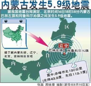 Rescue teams have been sent to the areas of Bairin Zuoqi and Ar Horqin Qi, Xinhua said. "An obvious tremor was also felt in the capital city of Beijing," Xinhua said. A quake measuring 6.2 on the Richter scale hit southwest China's Yunnan province late last month, killing at least 16 people and injuring some 584 others. The Red Cross said 700,000 people were seriously affected and were in desperate need of relief supplies.