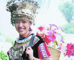 As darkness fell, we arrived in the small town of Jinping after 12 adventurous hours on a bus and we spent the night in a new four-storey hotel overlooking the Qingshui River. We took a boat the next day on the Qingshui River to Wendou Village. Our journey began in the morning mist with a gathering of people from the Dong National Minority to see us off. The boat was uniquely shaped with a length of more than 8 metres and a width of less than one metre. It looked just like a long willow leaf floating on the water. The Qingshui River is a branch of the Yangtze and flows through high mountain ranges still covered in virgin forests. There is an old saying that:" The Guilin landscape tops those found elsewhere and a trip to the Qingshui River will save you a trip to Guilin." As our boat floated on the azure water, amazing scenery met our eyes. The mountain peaks and the forests were partly hidden by a slight mist. The mist was rising from the surface of the water making the scenery near and far blur into the image of an ancient Chinese painting. The peaks climbing skywards were in various wonderful shapes which gave them the beautiful names still used today. A series of peaks called "Baxian Guohai" were seen as eight immortals crossing the sea. Then there is Qinglong Peak, which looks like a dragon lowering its head to drink. There are also peaks shaped like the Chinese God of Life reaching for a peach. Two peaks looking like deer holding flowers in their mouths were given the names, "Shouxing Zaiyue" and "Yelu Hanhua". As the boat went down the river, Miao and Dong-style wooden cottages, partly hidden on the hill slopes, could be seen. The boat occasionally had to struggle through narrow gorges with the current rushing between reefs. The sound of the torrent could be heard far away and the boatmen called this passage, the "Smaller Three Gorges". Surrounded by the weirdly shaped mountain peaks and with its powerful current, the Qingshui River is one of nature's wonders. Dancing Miao girls It took three hours to reach the village. Melodious singing was heard as we approached Wendou, the sound echoing up the nearby valleys. Six Miao women in light dark clothes with colourful embroidery were waiting on the riverbank holding six horns full of rice wine. The faster you finish drinking, the more respect you show the local people. Drinking water flows to every house through bamboo tubes from springs and can be drunk directly. The network of bamboo tubes is as effective a water supply system as any to be found in cities.