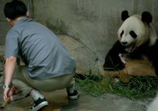 A newborn giant panda cub, weighing 180 grams, leans close to her mother August 26, 2003 in Beijing Zoo. Eight-year-old Niu Niu gave birth to the cub, her first, on Sunday. [newsphoto.com.cn]