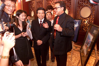 | | Charles Billich, a renowned artist engaged to paint for Olympic Games, presents his paintings to visitors at an exhibit of his works August 28, 2003 in Beijing. Billich's "I Love Beijing'' Painting Exhibition opened on Thursday and will close on September 7. Officials hope it will stimulate visitors' interest in Beijing, the host city of 2008 games, and encourage people to contribute to Beijing's prosperity.[newsphoto.com.cn] |